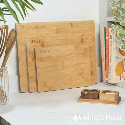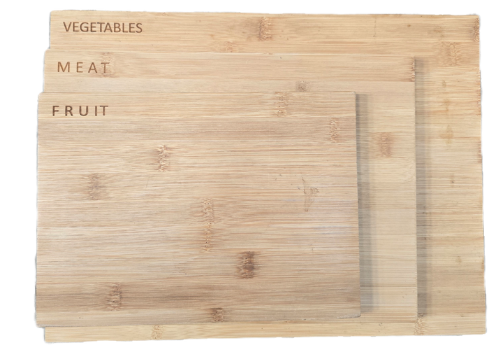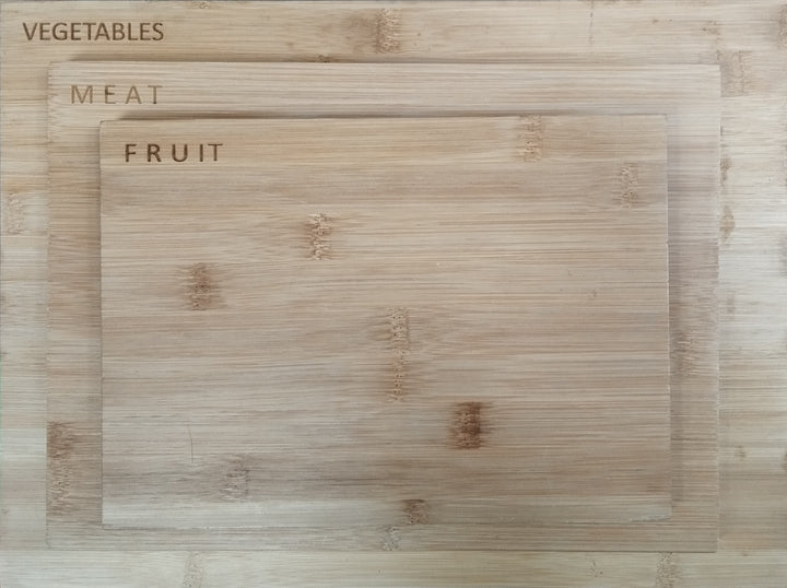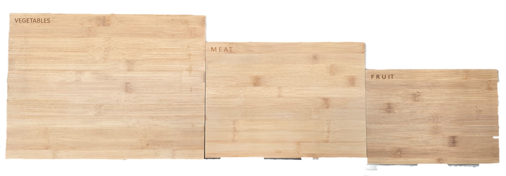 This set of three chopping boards is designed to keep your kitchen prep organized and hygienic. Each board is clearly labeled for its specific use—one for vegetables, one for meat, and one for fruit—helping you prevent cross-contamination and ensure food safety.