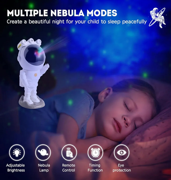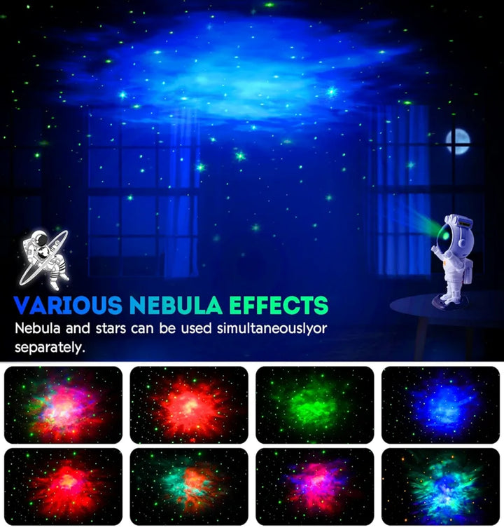 👨🚀【Astronaut Light Projector 】The astronaut’s appearance design is novel and unique, echoing the starry sky and galaxy theme, and takes you to explore the vast starry sky.This astronaut light projector night light has stunning nebula effects, and twinkling green stars.The perfect atmosphere light for movie night, date night or game night.