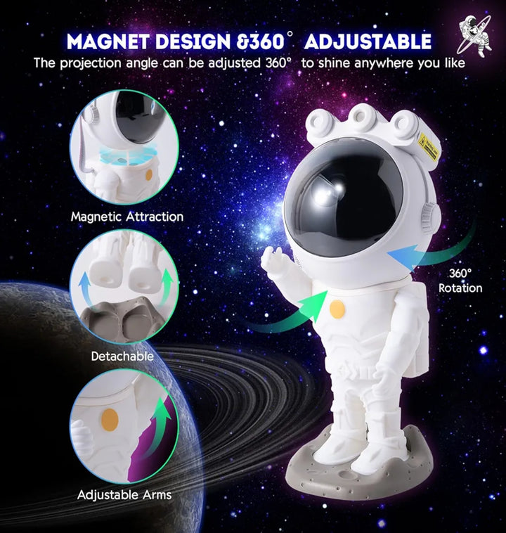 👨🚀【360° Head Rotation】The astronaut's head and body can be rotated by 360° to be magnetically connected to facilitate the adjustment of the nebula projection angle without restriction. In addition, the moon base is detachable and the arms can also be swung. It is not only a astronaut light projector, but also a beautiful decoration.