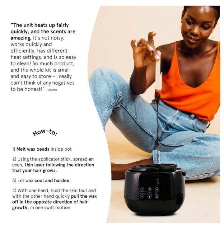 Clean and dry skin where hair will be removed. Melt wax beads inside pot and heat until completely melted. Test patch to make sure the temperature is not too hot. Using the applicator stick, spread an even, thin layer following the direction that your hair grows. Let wax cool and harden where you have just applied. With one hand, hold the skin taut and with the other hand quickly pull the wax off in the opposite direction of hair growth, in one swift motion.