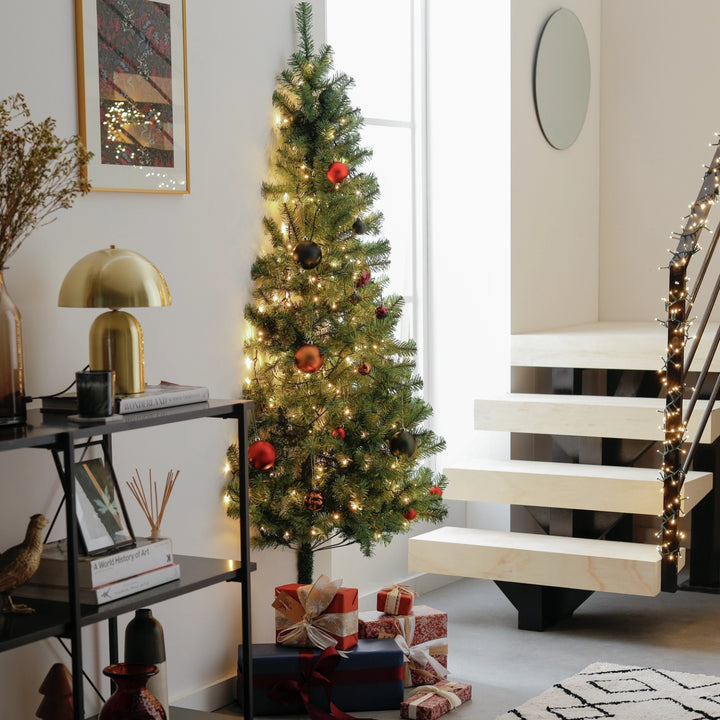 Lush and flush. Get a full front luxe look of a traditional 6ft Christmas tree but only take up half the floor space. With its flat back and special metal stand, you can place this faux tree flat against the wall. Smart eh?