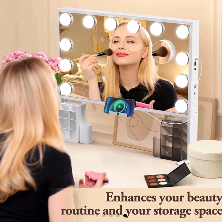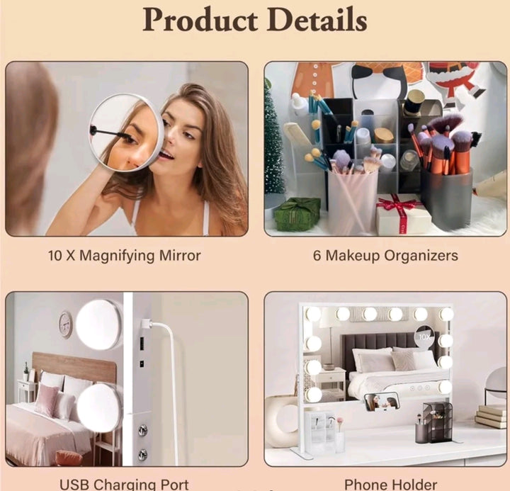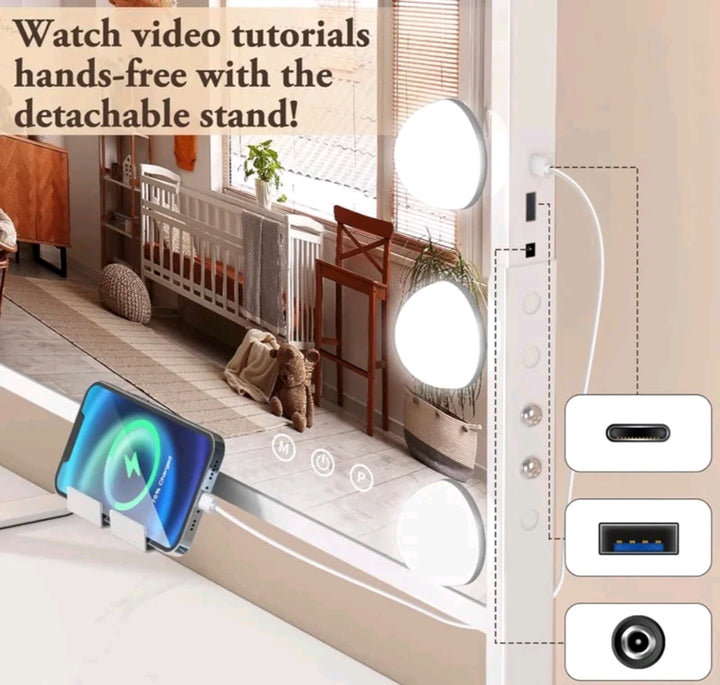 Phone Holder for Multitasking: The integrated phone holder allows you to place your phone while applying makeup, perfect for watching tutorials, playing videos, or answering calls without interrupting your routine. Whether you're using it with your Hollywood mirror, desk mirror, or lighted bathroom vanity mirror, this design boosts your multitasking efficiency.