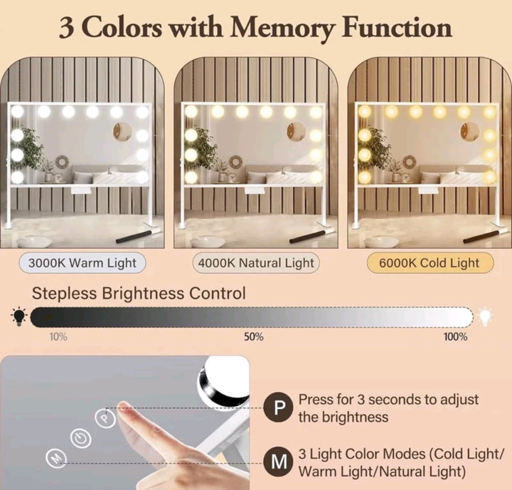 3 Light Settings & Stepless Brightness Adjustment: Customize your lighting with the “M” button to switch between Warm White (3000K), Natural White (4500K), and Cool White (6000K), perfect for makeup mirrors with lighting. The “P” button allows stepless brightness adjustment from 20% to 100%, letting you control the lighting based on your environment. Equipped with 12 high-quality LED lights for even, natural light, this mirror is perfect for both daily makeup routines and professional makeup contouring.