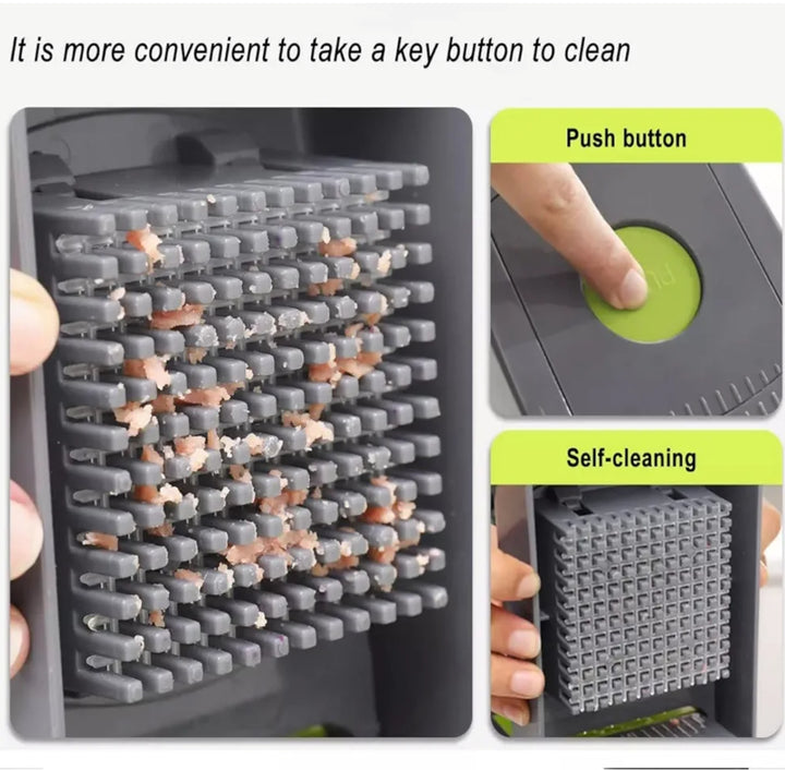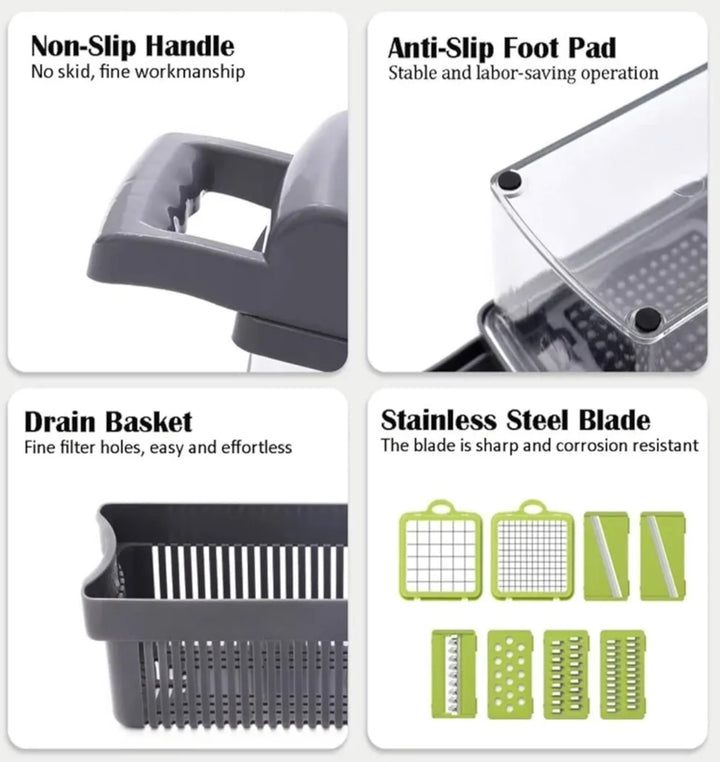 Superior quality - The latest multifunctional vegetable prep tool (made of high quality stainless steel and food grade plastic); this highly versatile tool will chop, dice, slice or grate most types of fruits and vegetables easily and safely. 14 blades/components - Veggie Slicer contains 7 different sizes of interchangeable blades for dicing, slicing or grating. The rust-resistant stainless steel maintains sharp edges for crisp cuts and smooth grating. The tool also holds a peeler, egg separator, press cut, colander, hand protector, cleaning brush and blade storage for a total of 14 pieces. Design innovation - The built-in cutting lid allows food to be cut directly on the unit and into a 1.2L storage container. Save time while eating healthier - Prepping fruits and vegetables takes time and effort: the 14 piece veggie slicer saves both while adding valuable nutrients to your diet.
