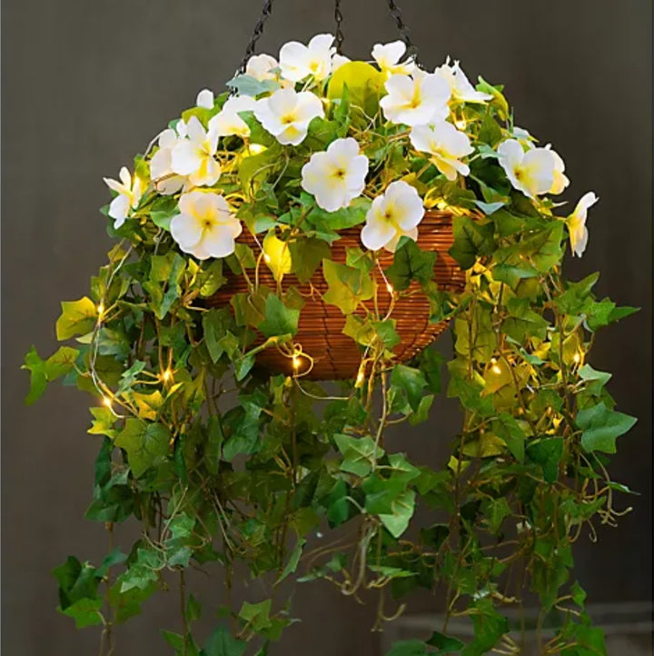 Beautify your outdoor space with this pre-lit faux pansy and trailing ivy hanging basket from Garden Reflections. Designed to instantly elevate any outdoor area with colour and style, this lifelike piece comes with battery-operated LED lights and a timer, ensuring a lovely glow through all seasons. Whether you're adorning a fence or enhancing your balcony, this charming hanging basket will infuse your space with elegance and warmth.