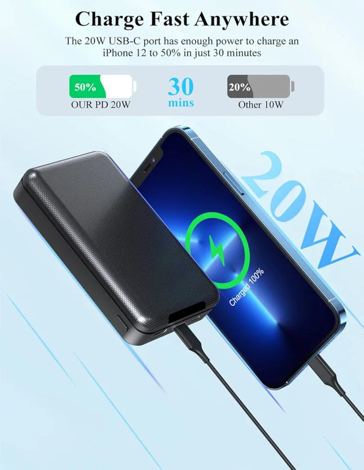 Charge your phone up to 50% in 30 minutes: quick charge function of QC 3.0 & PD 20W fast charging technology, your phone can be charged to 50% in just 30 minutes. With the dual fast charging technology, charging your devices faster.