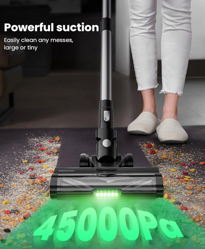 【Powerful Suction & Latest Motor】: The Proscenic P13 Cordless Vacuum Cleaner is equipped with the Proscenic upgraded brushless motor in 2025, which can provide 550W power, ensuring an unprecedented suction power up to 45Kpa,extended its lifespan 5 times .Easily and effectively removes dirt, debris, pet hair even on long-pile carpets.