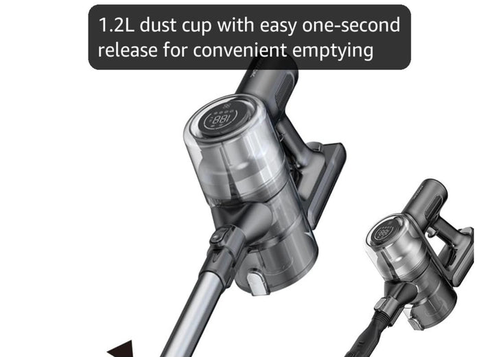 【LED Smart Touch Display】:The Stick Vacuum Cleaner has the latest LED smart sensor panel, showing a user-friendly interface, which you can touch to switch suction mode, check the battery charging status, dust collection bin filling status and real-time malfunction alarm.