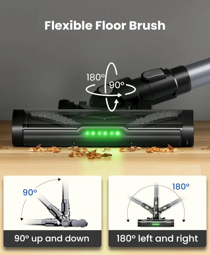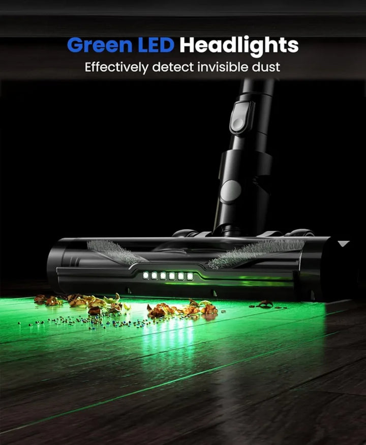 【Advanced Dust Detection & Flexible Reach】- With a built-in green light on the floor brush and additional LED lights on top, this Lightweight vacuum Cleaner For home easily reveals dust even in dark areas. Its extendable stick reaches up to 1.2 meters, effortlessly accessing areas like sofas, under beds, cabinets, car trunks, and more.