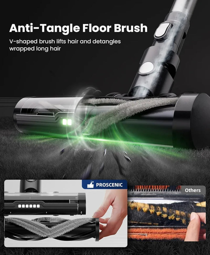 【Upgraded Anti-tangle Roller Brush】With the an improved V-shaped guiding bristle works with the internal comb, the Proscenic P13 Cordless vacuum cleaner gathers the hairs effectively without tangling, delivering powerful performance with less maintenance. Vacuuming hair has never been this simple. Great for family that has furry pets.