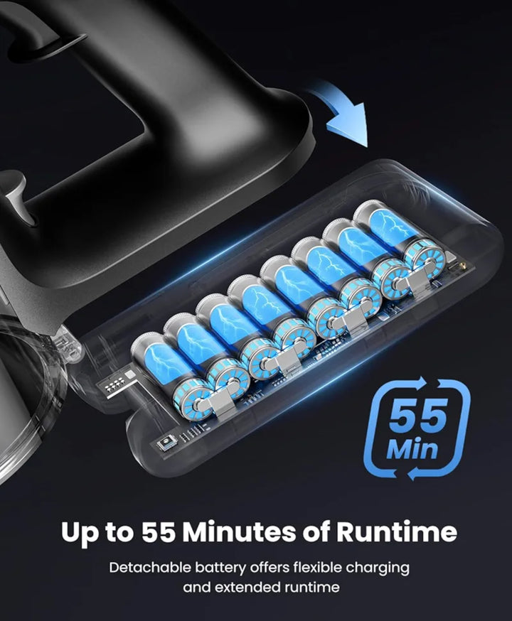【Up to 55 Mins Running Time】 2500mAh high capacity battery, 3-speed adjustment, minimum suction power up to 55 minutes, allowing you to clean the whole house in one go. This rechargeable Stick vacuum cleaner fully charges in just 3 hours.