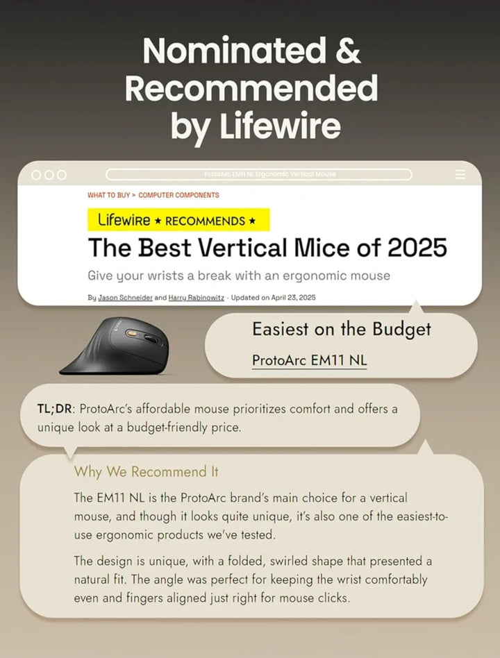 Wireless Ergonomic Design: ProtoArc ergonomic mouse features an extended wrist rest that fits snugly in the palm of your hand for a more natural, relaxed position of the forearm and wrist, reducing overall fatigue, compared to standard mice.
