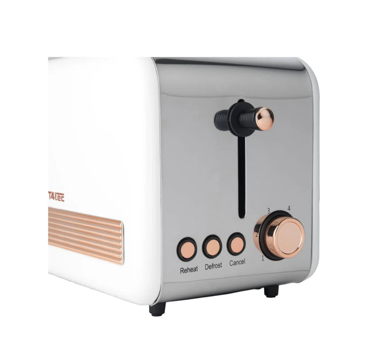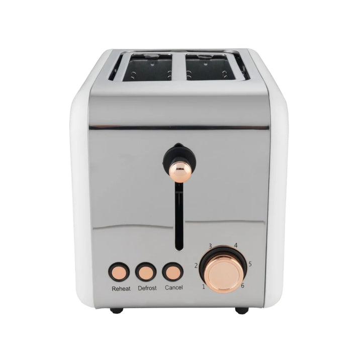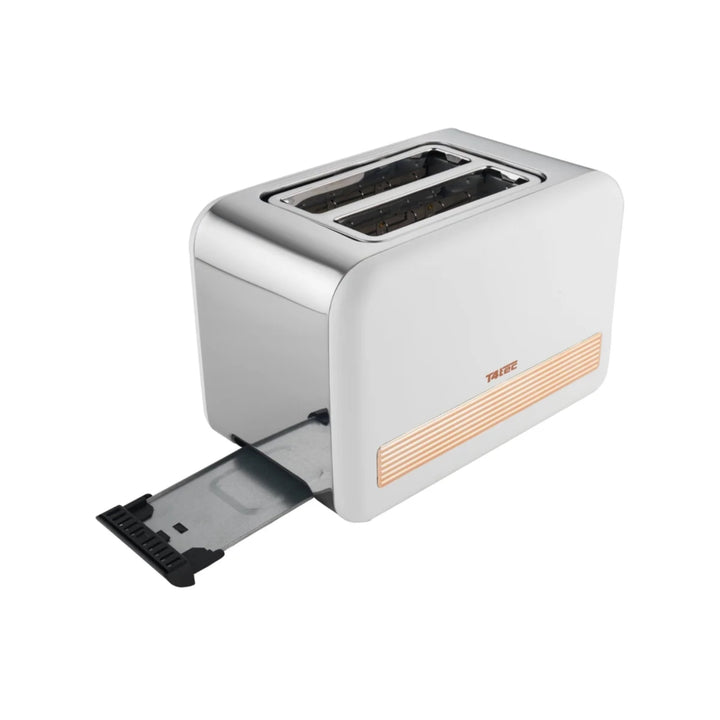 Boasting 850W power this stylish 2 slice toaster features Defrost, Cancel and Reheat bread buttons with indicator lights. Adjustable browning control helps you make toast just the way you like it, and the self-centring function aligns smaller sized bread for even toasting. The slide out crumb tray collects crumbs for mess-free toasting and easy cleaning, helping to keep your kitchen worktop tidy.